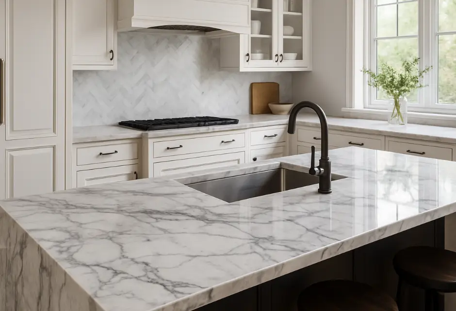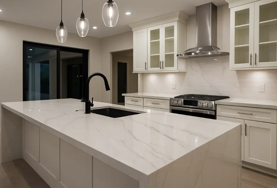 Modern Waterfall Island & Quartz Surfaces – Sleek White Kitchen Upgrade